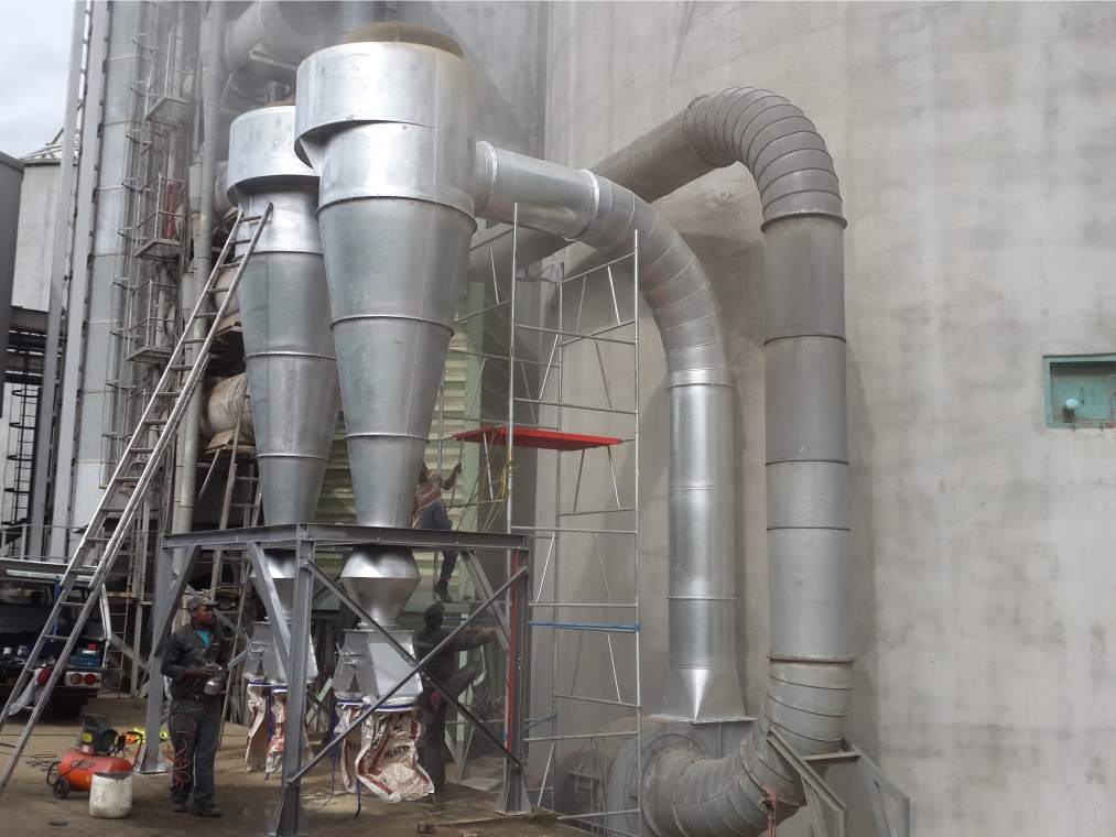 Finally, the “clean air” near the bottom of the cyclone changes direction and moves up the center of the cylinder to an exhaust tube or outlet, which is usually connected to a filter that catches any remaining fine particles.